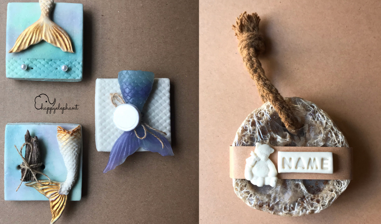 Made of glycerin, essential oils and organic herbs, the soaps can be scented with — among other things — jasmine, musk, lavender, baby powder, coffee and roses, in many different colors. The shapes of the soaps are customized and designed by the project manager in various themes for the customer to choose from.